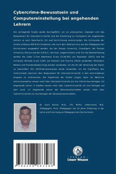 Die vorliegende Studie wurde durchgeführt, um zu untersuchen, inwieweit sich das Bewusstsein für Internetkriminalität und die Einstellung zu Computern bei angehenden Lehrern je nach Geschlecht, Ort und Fachrichtung unterscheidet. Die Stichprobe der Studie umfasste 400 B.Ed.-Studenten, die nach dem Zufallsprinzip aus den Pädagogischen Hochschulen ausgewählt wurden, die der Panjab University, Chandigarh, der Punjabi University, Patiala und der G.N.D.U., Amritsar, angeschlossen sind. Für die Datenerhebung wurden die Cyber Crime Awareness Scale (CCAS-RS) von Rajasekar (2013) und die Computer Attitude Scale (CAS) von Khatoon und Sharma (2012) verwendet. Mittelwert, Median und Standardabweichung wurden verwendet, um die Art der Verteilung der Daten zu überprüfen. Die 2X2X2-Varianzanalyse wurde verwendet, um die Signifikanz des Unterschieds zwischen dem Bewusstsein für Internetkriminalität in den verschiedenen Gruppen zu untersuchen. Die Ergebnisse der Studie zeigen, dass: (a) WeiblicheLehramtsanwärter wissen mehr über Internetkriminalität als ihre männlichen Kollegen. (b) Angehende Lehrer in Städten wissen mehr über Cyberkriminalität als ihre Kollegen auf dem Land. (c) Angehende Lehrer der Naturwissenschaften wissen mehr über Cyberkriminalität als ihre Kollegen der Geisteswissenschaften.