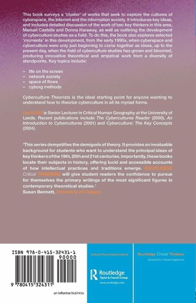 This book surveys a 'cluster' of works that seek to explore the cultures of cyberspace, the Internet and the information society. It introduces key ideas, and includes detailed discussion of the work of two key thinkers in this area, Manuel Castells and Donna Haraway, as well as outlining the development of cyberculture studies as a field. To do this, the book also explores selected 'moments' in this development, from the early 1990s, when cyberspace and cyberculture were only just beginning to come together as ideas, up to the present day, when the field of cyberculture studies has grown and bloomed, producing innovative theoretical and empirical work from a diversity of standpoints. Key topics include: