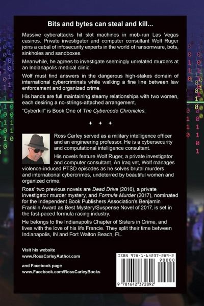Bits and bytes can steal and kill... Massive cyberattacks hit slot machines in mob-run Las Vegas casinos. Private investigator and computer consultant Wolf Ruger joins a cabal of infosecurity experts in the world of ransomware, bots, sinkholes and sandboxes. Meanwhile, he agrees to investigate seemingly unrelated murders at an Indianapolis medical clinic. Wolf must find answers in the dangerous and high stakes domains of international cybercriminals and mobsters while walking a fine line between law enforcement and organized crime. His hands are full maintaining steamy relationships with two women, each desiring a no-strings-attached arrangement. "Cyberkill" is Book One of The Cybercode Chronicles.