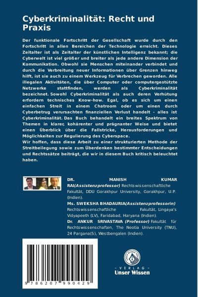 Der funktionale Fortschritt der Gesellschaft wurde durch den Fortschritt in allen Bereichen der Technologie erreicht. Dieses Zeitalter ist als Zeitalter der künstlichen Intelligenz bekannt; die Cyberwelt ist viel größer und breiter als jede andere Dimension der Kommunikation. Obwohl sie Menschen miteinander verbindet und durch die Verbreitung neuer Informationen über Grenzen hinweg hilft, ist sie auch zu einem Werkzeug für Verbrechen geworden. Alle illegalen Aktivitäten, die über Computer oder computergestützte Netzwerke stattfinden, werden als Cyberkriminalität bezeichnet. Sowohl Cyberkriminalität als auch deren Verhütung erfordern technisches Know-how. Egal, ob es sich um einen einfachen Streit in einem Chatroom oder um einen durch Cyberbetrug verursachten finanziellen Verlust handelt - alles ist Cyberkriminalität. Das Buch behandelt ein breites Spektrum von Themen in klarer, kohärenter und prägnanter Weise und bietet einen Überblick über die Fallstricke, Herausforderungen und Möglichkeiten zur Regulierung des Cyberspace.Wir hoffen, dass diese Arbeit zu einer strukturierten Methode der Streitbeilegung sowie zum Überdenken bestimmter Entscheidungen und Rechtssätze beiträgt, die wir in diesem Buch kritisch beleuchtet haben.