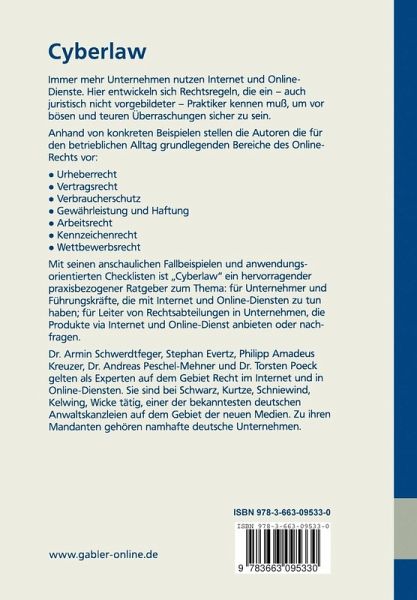 Mir seinen anschaulichen Fallbeispielen und anwendungsorientierten Checklisten ist "Cyberlaw" ein hervorragender praxisbezogener Ratgeber zum Thema: für Führungskräfte, die mit Internet und Online-Diensten zu tun haben,