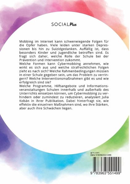 Mobbing im Internet kann schwerwiegende Folgen für die Opfer haben. Viele leiden unter starken Depressionen bis hin zu Suizidgedanken. Auffällig ist, dass besonders Kinder und Jugendliche betroffen sind. Es fragt sich daher, welche Rolle der Schule bei der Prävention und Intervention zukommt. Welche Formen kann Cybermobbing annehmen, wie wirkt es sich aus und welche strafrechtlichen Folgen zieht es nach sich? Welche Rahmenbedingungen müssen in einer Schule gegeben sein, um das Problem zu verringern? Welche Interventionsmaßnahmen gibt es und wie erfolgreich sind sie? Welche Programme, Hilfsangebote und Informationsveranstaltungen Schulen innerhalb und außerhalb des Unterrichts einsetzen können, um Cybermobbing zu verhindern oder zumindest zu reduzieren, analysiert Julia Kobán in ihrer Publikation. Dabei hinterfragt sie, wie effektiv die einzelnen Maßnahmen sind, wo ihre Stärken, aber auch ihre Schwächen liegen. Aus dem Inhalt:-Mobbing an Schulen;-Sekundarstufe 1;-Medienkompetenz;-Mediation;-Medienerziehung