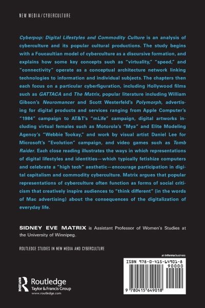 Cyberpop is an analysis of cyberculture and its popular cultural productions. The study begins with a Foucaultian model of cyberculture as a discursive formation, and explains how some key concepts (such as 'virtuality,' 'speed,' and 'Connectivity') operate as a conceptual architecture network linking technologies to information and individual subjects. The chapters then each focus on a particular cyberfiguration, including Hollywood films (GATTACA, The Matrix), popular literature (William Gibson's Neuromancer, Scott Westerfeld's Polymorph), advertising for digital products and services (Apple Computer's '1984/McIntosh' campaign, AT&T's 'mLife' campaign), digital artworks (including virtual females such as Motorola's 'Mya' and Elite Modeling Agency's 'Webbie Tookay,' and work by visual artist Daniel Lee for Microsoft's 'Evolution' campaign), and video games (Tomb Raider). Each close reading illustrates the ways in which representations of digital lifestyles and identities - which typically fetishize computers and celebrate a 'high tech' aesthetic encourage participation in digital capitalism and commodity cyberculture. Matrix argues that popular representations of cyberculture often function as forms of social criticism that creatively inspire audiences to 'think different' (in the words of Mac advertising) about the consequences of the digitalization of everyday life.