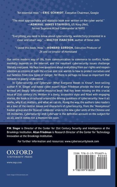 In Cybersecurity and CyberWar: What Everyone Needs to Know, New York Times best-selling author P. W. Singer and noted cyber expert Allan Friedman team up to provide the kind of easy-to-read, yet deeply informative resource book that has been missing on this crucial issue of 21st century life. Written in a lively, accessible style, filled with engaging stories and illustrative anecdotes, the book is structured around the key question areas of cyberspace and its security: how it all