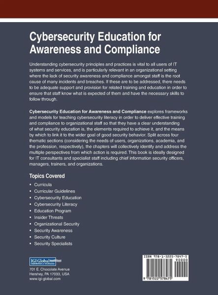 Understanding cybersecurity principles and practices is vital to all users of IT systems and services, and is particularly relevant in an organizational setting where the lack of security awareness and compliance amongst staff is the root cause of many incidents and breaches. If these are to be addressed, there needs to be adequate support and provision for related training and education in order to ensure that staff know what is expected of them and have the necessary skills to follow through. Cybersecurity Education for Awareness and Compliance explores frameworks and models for teaching cybersecurity literacy in order to deliver effective training and compliance to organizational staff so that they have a clear understanding of what security education is, the elements required to achieve it, and the means by which to link it to the wider goal of good security behavior. Split across four thematic sections (considering the needs of users, organizations, academia, and the profession, respectively), the chapters will collectively identify and address the multiple perspectives from which action is required. This book is ideally designed for IT consultants and specialist staff including chief information security officers, managers, trainers, and organizations.