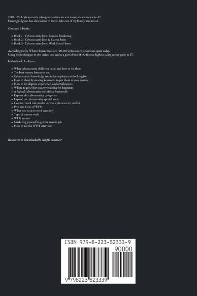 100K USD cybersecurity job opportunities are sent to me a few times a week! Earning 6 figures has allowed me to travel, take care of my family, and invest. Contains 3 books:Book 1 - Cybersecurity Jobs: Resume Marketing Book 2 - Cybersecurity Jobs & Career Paths Book 3 - Cybersecurity Jobs: Work From Home According to the White House, there are 700,000 cybersecurity positions open today. Using the techniques in this series, you can be a part of one of the fastest, highest-salary career paths in IT. In this book, I tell you:What cybersecurity skills you need, and how to list them The best resume format to use Cybersecurity knowledge and tasks employers are looking for How to cheat by stealing keywords to put them in your resume How to list degrees, experience, and certifications Where to get cyber security training for beginners A federal cybersecurity workforce framework Explore the cybersecurity categories Expand on cybersecurity special areas Connect work roles to the current cybersecurity market Pros and Cons of WFH What you need to work remotely Type of remote work WFH resume Marketing yourself to get the remote job How to ace the WFH interview Resources to downloadable sample resumes!