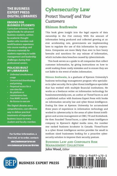 This book gives insight into the legal aspects of data ownership in the 21st century. With the amount of information being produced and collected growing at an ever accelerating rate, governments are implementing laws to regulate the use of this information by corporations. Companies are more likely than ever to face heavy lawsuits and sanctions for any misuse of information, which includes data breaches caused by cybercriminals. This book serves as a guide to all companies that collect customer information, by giving instructions on how to avoid making these costly mistakes and to ensure they are not liable in the event of stolen information.