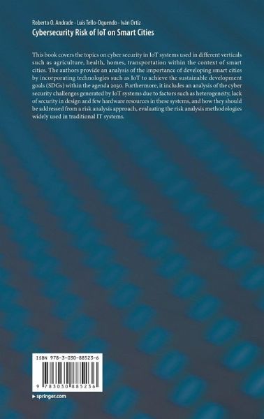 This book covers the topics on cyber security in IoT systems used in different verticals such as agriculture, health, homes, transportation within the context of smart cities. The authors provide an analysis of the importance of developing smart cities by incorporating technologies such as IoT to achieve the sustainable development goals (SDGs) within the agenda 2030. Furthermore, it includes an analysis of the cyber security challenges generated by IoT systems due to factors such as heterogeneity, lack of security in design and few hardware resources in these systems, and how they should be addressed from a risk analysis approach, evaluating the risk analysis methodologies widely used in traditional IT systems.