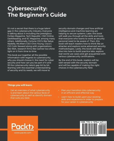 Cybersecurity jobs confines from basic configuration to advanced systems analysis and defense assessment. Cybersecurity: The Beginner's Guide provides thefundamental information you need to understand the basics of the field, identify your place within it, and start your Cybersecurity career.