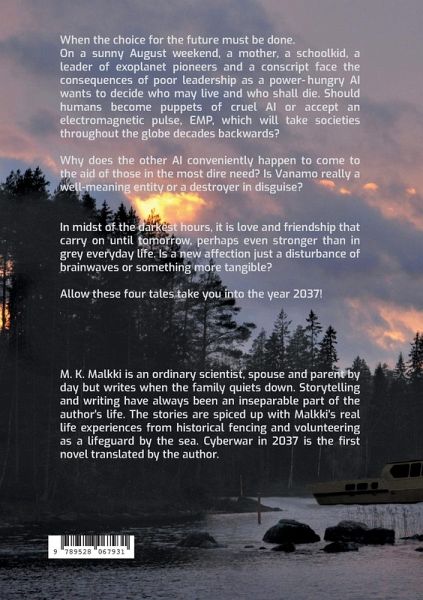 When the choice for the future must be made.On a sunny August weekend, a mother, a schoolkid, a leader of exoplanet pioneers and a conscript face the consequences of poor leadership as a power-hungry AI wants to decide who may live and who shall die. Should humans become puppets of cruelty or accept an electromagnetic pulse, EMP, which will take societies throughout the globe decades backwards? Why does the other AI conveniently happen to come to the aid of those in the most dire need? Is Vanamo really a well-meaning entity or a destroyer as in disguise? In midst of the darkest hours, it is love and friendship that carry on until tomorrow, perhaps even stronger than in grey everyday life. Is a new affection just a disturbance of brainwaves or something more tangible? Allow these four tales take you into the year 2037!