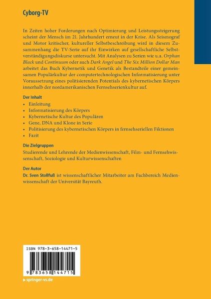 In Zeiten hoher Forderungen nach Optimierung und Leistungssteigerung scheint der Mensch im 21. Jahrhundert erneut in der Krise. Als Seismograf und Motor kritischer, kultureller Selbstbeschreibung wird in diesem Zusammenhang die TV-Serie auf ihr Einwirken auf gesellschaftliche Selbstverständigungsdiskurse untersucht. Mit Analysen zu Serien wie u.a. Orphan Black und Continuum oder auch Dark Angel und The Six Million Dollar Man arbeitet das Buch Kybernetik und Genetik als Bestandteile einer gemeinsamen Populärkultur der computertechnologischen Informatisierung unter Voraussetzung eines politisierenden Potentials des kybernetischen Körpers innerhalb der nordamerikanischen Fernsehserienkultur auf.