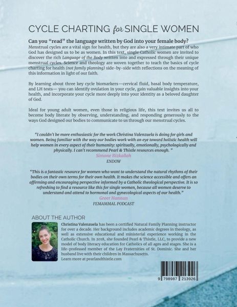 Can you "read" the language written by God into your female body? Menstrual cycles are a vital sign for health, but they are also a very intimate part of who God has designed us to be as women. In this text, single Catholic women are invited to discover the rich Language of the Body written into and expressed through their unique menstrual cycles. Science and theology are woven together to teach the basics of cycle charting for health (not family planning) side-by-side with reflections on the meaning of this information in light of our faith. By learning about three key cycle biomarkers-cervical fluid, basal body temperature, and LH tests- you can identify ovulation in your cycle, gain valuable insights into your health, and incorporate your cycle more deeply into your identity as a beloved daughter of God. Ideal for young adult women, even those in religious life, this text invites us all to become body literate by observing, understanding, and responding generously to the ways God designed our bodies to communicate to us through our menstrual cycles.