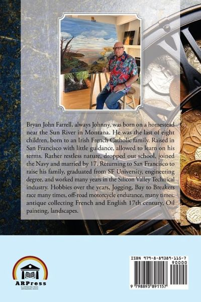 Bryan John Farrell, always Johnny, was born on a homestead near the Sun River in Montana. He was the last of eight children, born to an Irish French Catholic family. Raised in San Francisco with little guidance, allowed to learn on his terms. Rather restless nature, dropped out school, joined the Navy and married by 17. Returning to San Francisco to raise his family, graduated from SF University, engineering degree, and worked many years in the Silicon Valley Technical industry. Hobbies over the years, Jogging, Bay to Breakers race many times, off -road motorcycle endurance, many times, antique collecting French and English 17th century, Oil painting, landscapes.