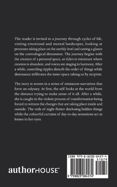 The reader is invited to a journey through cycles of life, visiting emotional and mental landscapes, looking at processes taking place on the earthly level and casting a glance on the cosmological dimension. The journey begins with the creation of a personal space, an Eden in miniature where creation is abundant, and voices are singing in harmony. After a while, unsettling ripples disturb the order of things while dissonance infiltrates the inner space taking us by surprise. The story is woven in a series of miniature-narratives that form an odyssey. At first, the self looks at the world from the distance trying to make sense of it all. After a while, she is caught in the violent process of transformation being forced to witness the changes that are taking place inside and outside. The veils of night flutter disclosing hidden things while the colourful curtains of day-to-day sensations act as lenses to her eyes.