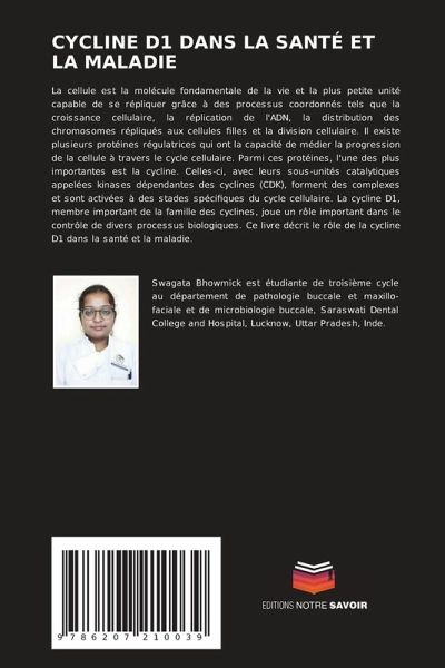 La cellule est la molécule fondamentale de la vie et la plus petite unité capable de se répliquer grâce à des processus coordonnés tels que la croissance cellulaire, la réplication de l'ADN, la distribution des chromosomes répliqués aux cellules filles et la division cellulaire. Il existe plusieurs protéines régulatrices qui ont la capacité de médier la progression de la cellule à travers le cycle cellulaire. Parmi ces protéines, l'une des plus importantes est la cycline. Celles-ci, avec leurs sous-unités catalytiques appelées kinases dépendantes des cyclines (CDK), forment des complexes et sont activées à des stades spécifiques du cycle cellulaire. La cycline D1, membre important de la famille des cyclines, joue un rôle important dans le contrôle de divers processus biologiques. Ce livre décrit le rôle de la cycline D1 dans la santé et la maladie.