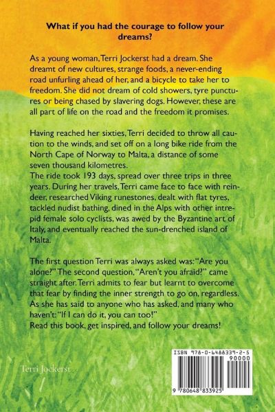 What if you had the courage to follow your dreams? As a young woman, Terri Jockerst had a dream. She dreamt of new cultures, strange foods, a never-ending road unfurling ahead of her, and a bicycle to take her to freedom. She did not dream of cold showers, tyre punctures or being chased by slavering dogs. However, these are all part of life on the road and the freedom it promises. Having reached her sixties, Terri decided to throw all caution to the winds, and set off on a long bike ride from the North Cape of Norway to Malta, a distance of some seven thousand kilometres. The ride took 193 days, spread over three trips in three years. During her travels, Terri came face to face with reindeer, researched Viking runestones, dealt with flat tyres, tackled nudist bathing, dined in the Alps with other intrepid female solo cyclists, was awed by the Byzantine art of Italy, and eventually reached the sun-drenched island of Malta. The first question Terri was always asked was: "Are you alone?" The second question, "Aren't you afraid?" came straight after. Terri admits to fear but learnt to overcome that fear by finding the inner strength to go on, regardless. As she has said to anyone who has asked, and many who haven't: "If I can do it, you can too!" Read this book, get inspired, and follow your dreams!