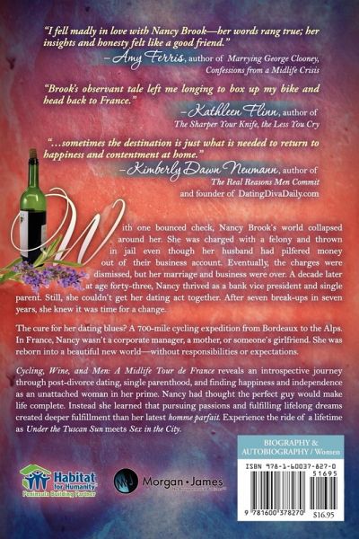 Cycling, Wine, & Men explores the author's parallel journeys: one on a bicycle cycling across France; the other as a divorced woman cycling through men. Written in a self-confession style that echoes Elizabeth Gilbert's bestseller Eat, Pray, Love, Cycling, Wine, & Men is a quick-paced dating/adventure story that women will devour.
