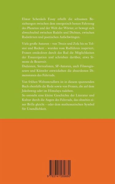 Elmar Schenkels Essay erhellt die seltsamen Beziehungen zwischen dem energetisch besten Fahrzeug des Planeten und der Welt der Wörter; er bewegt sich abwechselnd zwischen Radeln und Dichten, zwischen Radstürzen und poetischen Aufschwüngen.Viele große Autoren - von Twain und Zola bis zu Tolstoi und Beckett - wurden vom Radfahren inspiriert. Frauen entdeckten durch das Rad die Möglichkeiten der Emanzipation und schrieben darüber, etwa Simone de Beauvoir.Dadaisten, Surrealisten, SF-Autoren, auch Filmregisseure und Künstler entwickelten die absurdesten Dimensionen des Fahrrads.Von frühen Weltumradlern ist in diesem spannenden Buch ebenfalls die Rede sowie von Frauen, die auf dem Jakobsweg oder im Himalaya radelten. So entsteht eine kleine Geschichte der Literatur und Kultur durch die Augen des Fahrrads, das ohnehin einer Brille gleicht - oder dem mathematischen Symbol für Unendlichkeit.