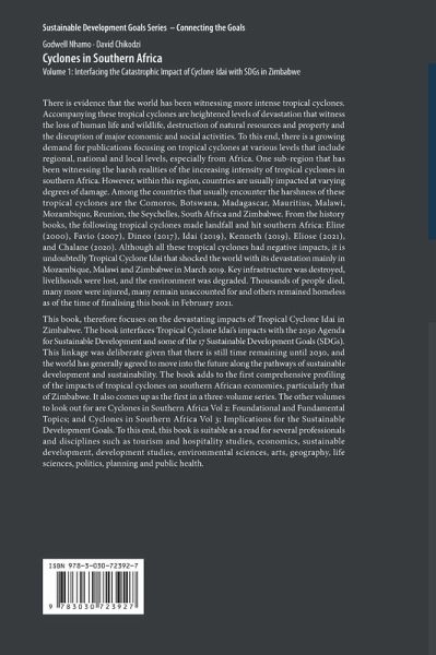 This book, therefore focuses on the devastating impacts of Tropical Cyclone Idai in Zimbabwe. The book interfaces Tropical Cyclone Idai's impacts with the 2030 Agenda for Sustainable Development and some of the 17 Sustainable Development Goals (SDGs). This linkage was deliberate given that there is still time remaining until 2030, and the world has generally agreed to move into the future along the pathways of sustainable development and sustainability. The book adds to the first comprehensive profiling of the impacts of tropical cyclones on southern African economies, particularly that of Zimbabwe. It also comes up as the first in a three-volume series. The other volumes to look out for are Cyclones in Southern Africa Vol 2: Foundational and Fundamental Topics; and Cyclones in Southern Africa Vol 3: Implications for the Sustainable Development Goals. To this end, this book is suitable as a read for several professionals and disciplines such as tourism and hospitality studies, economics, sustainable development, development studies, environmental sciences, arts, geography, life sciences, politics, planning and public health.
