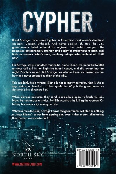 A government-engineered assassin struggles against his programming, in Matt Ryland's Cypher, the first in a thrilling new trilogy featuring former marine sniper Brent Savage. Brent Savage, code name Cypher, is Operation Darkwater's deadliest assassin. Unseen. Unheard. And never spoken of. He's the U.S. government's latest attempt to engineer the perfect weapon. He possesses extraordinary strength and agility, is impervious to pain, and feels no remorse. What's more, he always obeys orders without fail. Until now. For Savage, it's just another routine hit. Snipe Eliana, the beautiful $2000 an-hour call girl in her high-rise Miami condo, and slip away into the night. Problem solved. But Savage has always been so focused on the how he's never stopped to think of the why. This suddenly feels wrong. Eliana is not a known terrorist. Nor is she a spy, traitor, or head of a crime syndicate. Why is the government so determined to eliminate her? When Savage hesitates, they send in a backup agent to finish the job. Now, he must make a choice. Fulfill his contract by killing the woman. Or betray his country by saving her life. Whatever his decision, Savage knows the government will stop at nothing to keep Eliana's secret from getting out, even if that means eliminating their perfect weapon to do it.