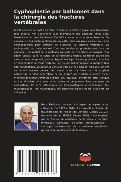 Les lésions de la moelle épinière restent un problème grave pour l'humanité tout entière. Non seulement elles provoquent des douleurs, mais elles limitent aussi considérablement l'activité sociale de la personne blessée. De nouveaux types d'interventions chirurgicales mini-invasives sont en cours de développement pour corriger et stabiliser la colonne vertébrale. La cyphoplastie par ballonnet est l'une des tendances prometteuses dans ce domaine. L'essentiel de la méthode consiste en l'insertion percutanée d'un ballon spécial dans le corps de la vertèbre affectée. Le ballon est inséré dans un état comprimé, puis un liquide est injecté sous pression. Le ballon se répand dans le corps vertébral, ce qui permet de réduire la compression post-traumatique. Le ballon est ensuite retiré et la cavité formée est remplie de ciment osseux pâteux. Le ciment osseux à base de méthacrylate polymérise pendant l'opération, ce qui assure une stabilité primaire. Cette méthode présente l'avantage d'être peu invasive, d'avoir un effet clinique rapide, d'utiliser une anesthésie locale et de pouvoir être pratiquée en ambulatoire. Ce livre intéressera les traumatologues orthopédiques, les rhumatologues, les neurologues, les neurochirurgiens et les étudiants en médecine.