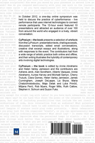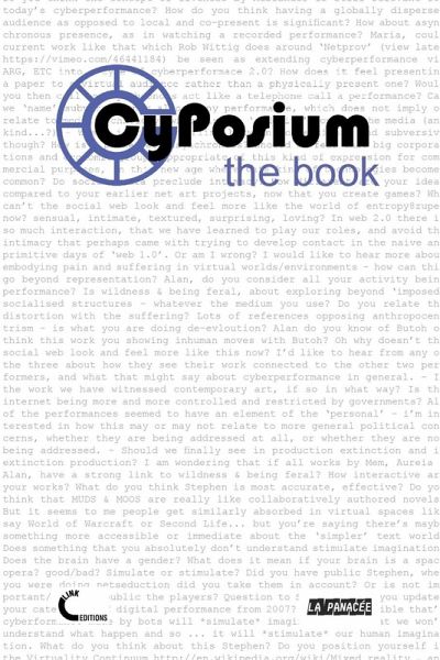 In October 2012, a one-day online symposium created a platform for discussing the practice of cyberformance - live performance that uses internet technologies to connect remote participants. The 12-hour event featured 10 presentations and attracted an audience of over 100 from around the world who engaged in a lively, vibrant conversation. This book presents a selection of artefacts from the CyPosium - presentation texts, chat log excerpts, discussion transcripts, edited email conversations, creative chat excerpt essays and illustrations - along with invited articles that respond to the event. Contributors: Adriene Jenik, Alan Sondheim, Alberto Vazquez, Annie Abrahams, Auriea Harvey and Michaël Samyn, Cherry Truluck, Clara Gomes, Helen Varley Jamieson, James Cunningham, Joseph DeLappe, Liz Bryce, Maria Chatzichristodoulou, Maja Delak and Luka Prin¿i¿, Miljana Peri¿, Rob Myers, Roger Mills, Ruth Catlow, Stephen A. Schrum and Suzon Fuks.