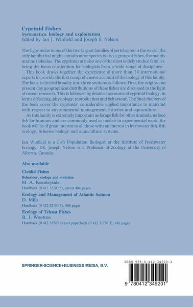 1 Systematics and biogeography: an overview.- 2 The fossil record of the Cyprinidae.- 3 Morphometric investigations in cyprinid biology.- 4 Molecular and cytological investigations.- 5 Cyprinids of Eurasia.- 6 Cyprinids of South East Asia.- 7 Cyprinids of Africa.- 8 Cyprinids of the New World.- 9 Cyprinids of Australasia.- 10 Brain and sensory systems.- 11 Acoustico-lateralis system.- 12 Diets and feeding behavior.- 13 Food capture and oral processing.- 14 Digestion.- 15 Physiological energetics and ecophysiology.- 16 Growth and production.- 17 Reproduction and life history.- 18 Social behaviour, homing and migration.- 19 Interspecific interactions.- 20 The role of cyprinids in ecosystems.- 21 Fisheries.- 22 Aquaculture.- Author index.- Taxonomic index.
