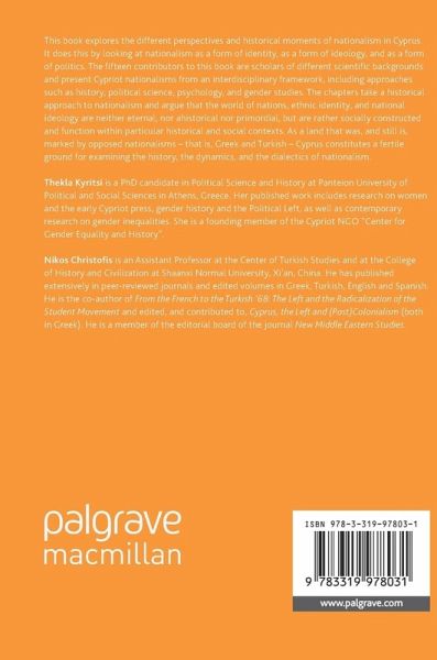 1. Introduction: Cypriot Nationalism(s) in Context; Nikos Christofis and Thekla Kyritsi.-PART I: EARLY AGENTS OF NATIONALISM.- 2. The Rise of Greek Cypriot Nationalism to Hegemony: Agency, Particularities and Popularization; Yiannos Katsourides.- 3. National Identity, Otherness and Bi-communal Relations through the Cypriot Greek-speaking Press between 1878-1912; Petros Nikolaou.- 4. The Legislative Council (1882-1931) and its Historical/Political Implications in Cyprus; Meltem Onurkan-Samani.- 5. Engendering Nationalism in modern Cyprus: The First Women's Organizations; Thekla Kyritsi.- PART II: MOMENTS OF A MASS MOVEMENT.- 6. Cyprus in the 1940s: the Nationalization of Greek Cypriot Politics; Dimitris Kalantzopoulos.- 7. Imported Nationalism: The Appearance and Evolution of "X" Organization in Cyprus; Alexios Alecou.- 8. Nationalism and Failed Reunification Attempts: Makarios and "Bu Memleket Bizim"; Sevki Kiralp.- PART III: NATIONAL IDENTIY & THE DEVELOPMENT OF PREJUDICE.- 9. Between Nationalist Absorption and Subsumption: Reflecting on the Armenian Cypriot Experience; Sossie Kasbarian.- 10. Turkish Migration into the North of Cyprus and the (re)Construction of Turkish Cypriot Identity in the Turkish Cypriot Press (1995-2013); Mustafa Çirakli.- 11. The Development of Prejudice in Children: the Case of Cyprus; Maria Ioannou and Angelos P. Kassianos.- 12. An Appraisal of the Work of Rolandos Katsiaounis: Society, Labor and Anti-Colonialism in Cyprus,1850s-1950s; Andrekos Varnava.- PART IV: THE LOCAL AND THE GLOBAL.- 13. Nationalism as Resistance to Colonialism: A Comparative Look at Malta and Cyprus from 1919 to 1940; Iliya Marovich-Old.- 14. Encountering Imperialism and Colonialism: The Greek and Turkish Left in Cyprus; Nikos Christofis.- 15. Patriots and Internationalists. The Greek Left, the Cyprus Question and Latin America; Eugenia Palieraki.