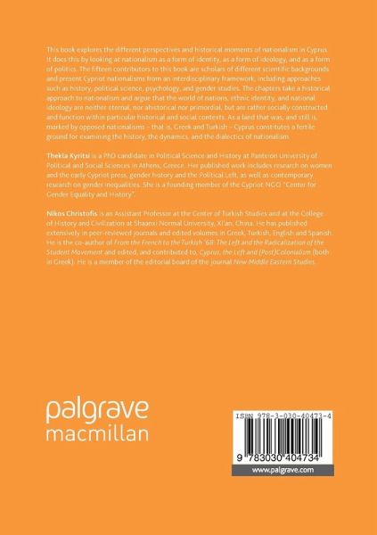 This book explores the different perspectives and historical moments of nationalism in Cyprus. It does this by looking at nationalism as a form of identity, as a form of ideology, and as a form of politics. The fifteen contributors to this book are scholars of different scientific backgrounds and present Cypriot nationalisms from an interdisciplinary framework, including approaches such as history, political science, psychology, and gender studies. The chapters take a historical approach to nationalism and argue that the world of nations, ethnic identity, and national ideology are neither eternal, nor ahistorical nor primordial, but are rather socially constructed and function within particular historical and social contexts. As a land that was, and still is, marked by opposed nationalisms - that is, Greek and Turkish - Cyprus constitutes a fertile ground for examining the history, the dynamics, and the dialectics of nationalism.