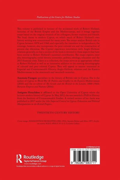 This volume is published in honour of the acclaimed work of Robert Holland, historian of the British Empire and the Mediterranean, and it brings together essays based on the original research of his colleagues, former students and friends. The focal theme is modern Cyprus, on which much of Robert Holland's own history writing was concentrated for many years. The essays analyse British rule in Cyprus between 1878 and 1960, and especially the transition to independence; the coverage, however, also incorporates the post-colonial era and the construction of present-day dilemmas. The Cypriot experience intertwines with Anglo-Hellenic relations generally, so that a section of the book is devoted to those aspects that have been central to Robert Holland's sustained contribution. The essays explore, inter alia, historiography, social history, economics, politics, ideology, education and the 2013 financial crisis. Taken as a collection the essays serve as an appropriate tribute to Robert Holland as well as an innovative addition to the existing historiography of colonial and post-colonial Cyprus. They will be of great interest to anyone interested in Imperial and Commonwealth History, Anglo-Hellenic relations and the Eastern Mediterranean in the nineteenth and twentieth centuries.