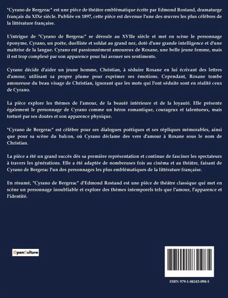 "Cyrano de Bergerac" est une pièce de théâtre emblématique écrite par Edmond Rostand, dramaturge français du XIXe siècle. Publiée en 1897, cette pièce est devenue l'une des ¿uvres les plus célèbres de la littérature française. L'intrigue de "Cyrano de Bergerac" se déroule au XVIIe siècle et met en scène le personnage éponyme, Cyrano, un poète, duelliste et soldat au grand nez, doté d'une grande intelligence et d'une maîtrise de la langue. Cyrano est passionnément amoureux de Roxane, une belle jeune femme, mais il est trop complexé par son apparence pour lui avouer ses sentiments. Cyrano décide d'aider un jeune homme, Christian, à séduire Roxane en lui écrivant des lettres d'amour, utilisant sa propre plume pour exprimer ses émotions. Cependant, Roxane tombe amoureuse du beau visage de Christian, ignorant que les mots qui l'ont séduite sont en réalité ceux de Cyrano. La pièce explore les thèmes de l'amour, de la beauté intérieure et de la loyauté. Elle présente également le personnage de Cyrano comme un héros romantique, courageux et talentueux, mais torturé par ses doutes et son apparence physique. "Cyrano de Bergerac" est célèbre pour ses dialogues poétiques et ses répliques mémorables, ainsi que pour sa scène du balcon, où Cyrano déclame des vers d'amour à Roxane sous le nom de Christian. La pièce a été un grand succès dès sa première représentation et continue de fasciner les spectateurs à travers les générations. Elle a été adaptée de nombreuses fois au cinéma et au théâtre, faisant de Cyrano de Bergerac l'un des personnages les plus emblématiques de la littérature française. En résumé, "Cyrano de Bergerac" d'Edmond Rostand est une pièce de théâtre classique qui met en scène un personnage inoubliable et explore des thèmes intemporels tels que l'amour, l'apparence et l'identité.