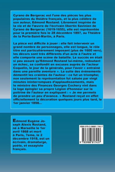 Cyrano de Bergerac est l'une des pièces les plus populaires du théâtre français, et la plus célèbre de son auteur, Edmond Rostand. Librement inspirée de la vie et de l'¿uvre de l'écrivain libertin Savinien de Cyrano de Bergerac (1619-1655), elle est représentée pour la première fois le 28 décembre 1897, au Théâtre de la Porte-Saint-Martin, à Paris. La pièce est difficile à jouer : elle fait intervenir un grand nombre de personnages, elle est longue, le rôle titre est particulièrement imposant (plus de 1600 vers), les décors sont très différents d'un acte à l'autre et elle comporte une scène de bataille. Le succès en était si peu assuré qu'Edmond Rostand lui-même, redoutant un échec, se confondit en excuses auprès de l'acteur Coquelin, le jour de la générale, pour l'avoir entraîné dans une pareille aventure . La suite des évènements démentit les craintes de l'auteur : ce fut un triomphe; non seulement la représentation fut saluée par vingt minutes ininterrompues d'applaudissements, mais le ministre des Finances Georges Cochery vint dans la loge épingler sa propre Légion d'honneur sur la poitrine de l'auteur en expliquant : Je me permets de prendre un peu d'avance. Rostand reçut en effet officiellement la décoration quelques jours plus tard, le 1er janvier 1898...