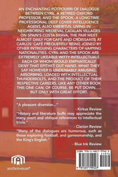 An enchanting potpourri of dialogue between an Oxford professor and a deep cover intelligence agent, both retired and living on Northern Spain's Costa Brava. The pair meet almost daily for Café and croissants at Carlo's Café where they are frequently joined by other regulars of varying nationalities. Cyril and the spook are very likeable intellectuals each of whom would deny that epithet out hand. What they say however is amusing, absorbing, and often too intellectually shocking. Like any other book this one can be put down...but not without great effort.