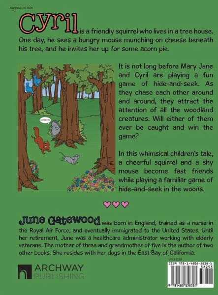 Cyril is a friendly squirrel who lives in a tree house. One day, he sees a hungry mouse munching on cheese beneath his tree, and he invites her up for some acorn pie. It is not long before Mary Jane and Cyril are playing a fun game of hide-and-seek. As they chase each other around and around, they attract the attention of all the woodland creatures. Will either of them ever be caught and win the game? In this whimsical childrens tale, a cheerful squirrel and a shy mouse become fast friends while playing a familiar game of hide-and-seek in the woods.
