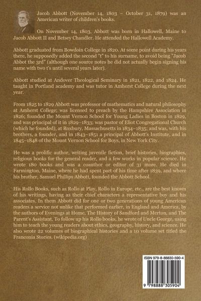 Abbott is an excellent story teller and historian. Though short, his series on history serves as an excellent primer. (Patrick Trester) About the author: Jacob Abbott (November 14, 1803 - October 31, 1879) was an American writer of children's books. On November 14, 1803, Abbott was born in Hallowell, Maine to Jacob Abbott II and Betsey Chandler. He attended the Hallowell Academy. Abbott graduated from Bowdoin College in 1820. At some point during his years there, he supposedly added the second "t" to his surname, to avoid being "Jacob Abbot the 3rd" (although one source notes he did not actually begin signing his name with two t's until several years later). Abbott studied at Andover Theological Seminary in 1821, 1822, and 1824. He taught in Portland academy and was tutor in Amherst College during the next year. From 1825 to 1829 Abbott was professor of mathematics and natural philosophy at Amherst College; was licensed to preach by the Hampshire Association in 1826; founded the Mount Vernon School for Young Ladies in Boston in 1829, and was principal of it in 1829-1833; was pastor of Eliot Congregational Church (which he founded), at Roxbury, Massachusetts in 1834-1835; and was, with his brothers, a founder, and in 1843-1851 a principal of Abbott's Institute, and in 1845-1848 of the Mount Vernon School for Boys, in New York City. He was a prolific author, writing juvenile fiction, brief histories, biographies, religious books for the general reader, and a few works in popular science. He wrote 180 books and was a coauthor or editor of 31 more. He died in Farmington, Maine, where he had spent part of his time after 1839, and where his brother, Samuel Phillips Abbott, founded the Abbott School. His Rollo Books, such as Rollo at Play, Rollo in Europe, etc., are the best known of his writings, having as their chief characters a representative boy and his associates. In them Abbott did for one or two generations of young American readers a service not unlike that performed earlier, in England and America, by the authors of Evenings at Home, The History of Sandford and Merton, and The Parent's Assistant. To follow up his Rollo books, he wrote of Uncle George, using him to teach the young readers about ethics, geography, history, and science. He also wrote 22 volumes of biographical histories and a 10 volume set titled the Franconia Stories. (wikipedia.org)