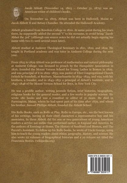 Abbott is an excellent story teller and historian. Though short, his series on history serves as an excellent primer. (Patrick Trester) About the author: Jacob Abbott (November 14, 1803 - October 31, 1879) was an American writer of children's books. On November 14, 1803, Abbott was born in Hallowell, Maine to Jacob Abbott II and Betsey Chandler. He attended the Hallowell Academy. Abbott graduated from Bowdoin College in 1820. At some point during his years there, he supposedly added the second "t" to his surname, to avoid being "Jacob Abbot the 3rd" (although one source notes he did not actually begin signing his name with two t's until several years later). Abbott studied at Andover Theological Seminary in 1821, 1822, and 1824. He taught in Portland academy and was tutor in Amherst College during the next year. From 1825 to 1829 Abbott was professor of mathematics and natural philosophy at Amherst College; was licensed to preach by the Hampshire Association in 1826; founded the Mount Vernon School for Young Ladies in Boston in 1829, and was principal of it in 1829-1833; was pastor of Eliot Congregational Church (which he founded), at Roxbury, Massachusetts in 1834-1835; and was, with his brothers, a founder, and in 1843-1851 a principal of Abbott's Institute, and in 1845-1848 of the Mount Vernon School for Boys, in New York City. He was a prolific author, writing juvenile fiction, brief histories, biographies, religious books for the general reader, and a few works in popular science. He wrote 180 books and was a coauthor or editor of 31 more. He died in Farmington, Maine, where he had spent part of his time after 1839, and where his brother, Samuel Phillips Abbott, founded the Abbott School. His Rollo Books, such as Rollo at Play, Rollo in Europe, etc., are the best known of his writings, having as their chief characters a representative boy and his associates. In them Abbott did for one or two generations of young American readers a service not unlike that performed earlier, in England and America, by the authors of Evenings at Home, The History of Sandford and Merton, and The Parent's Assistant. To follow up his Rollo books, he wrote of Uncle George, using him to teach the young readers about ethics, geography, history, and science. He also wrote 22 volumes of biographical histories and a 10 volume set titled the Franconia Stories. (wikipedia.org)