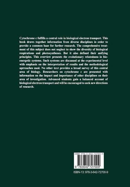 Cytochrome c fulfills a central role in biological electron transport. This book draws together information from diverse disciplines in order to provide a common base for further research. The comprehensive treatment of this subject does not neglect to show the diversity of biological respirations and photosyntheses. But it also defines their unifying principles. This overview presents the evolutionary relatedness in bioenergetic systems. Such systems are discussed at the experimental level with emphasis on the interpretation of results and the methodological approaches used. No other text provides a broad survey of this central area of biology. Researchers on cytochrome c are presented with information on the impact and importance of other disciplines on their area of investigation. Advanced students gain a balanced account of biological electron transport and will be encouraged to seek new directions of research.
