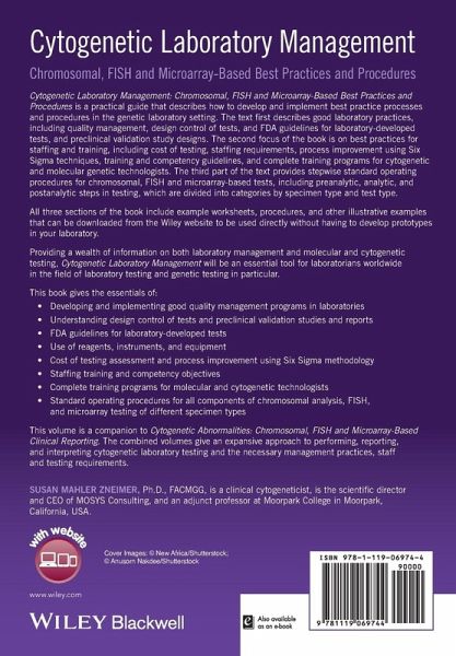 Cytogenetic Laboratory Management Chromosomal, FISH and Microarray-Based Best Practices and Procedures Cytogenetic Laboratory Management: Chromosomal, FISH and Microarray-Based Best Practices and Procedures is a practical guide that describes how to develop and implement best practice processes and procedures in the genetic laboratory setting. The text first describes good laboratory practices, including quality management, design control of tests, and FDA guidelines for laboratory-developed tests, and preclinical validation study designs. The second focus of the book is on best practices for staffing and training, including cost of testing, staffing requirements, process improvement using Six Sigma techniques, training and competency guidelines, and complete training programs for cytogenetic and molecular genetic technologists. The third part of the text provides stepwise standard operating procedures for chromosomal, FISH and microarray-based tests, including preanalytic, analytic, and postanalytic steps in testing, which are divided into categories by specimen type and test type. All three sections of the book include example worksheets, procedures, and other illustrative examples that can be downloaded from the Wiley website to be used directly without having to develop prototypes in your laboratory. Providing a wealth of information on both laboratory management and molecular and cytogenetic testing, Cytogenetic Laboratory Management will be an essential tool for laboratorians worldwide in the field of laboratory testing and genetic testing in particular. This book gives the essentials of: * Developing and implementing good quality management programs in laboratories * Understanding design control of tests and preclinical validation studies and reports * FDA guidelines for laboratory-developed tests * Use of reagents, instruments, and equipment * Cost of testing assessment and process improvement using Six Sigma methodology * Staffing training and competency objectives * Complete training programs for molecular and cytogenetic technologists * Standard operating procedures for all components of chromosomal analysis, FISH, and microarray testing of different specimen types This volume is a companion to Cytogenetic Abnormalities: Chromosomal, FISH and Microarray-Based Clinical Reporting. The combined volumes give an expansive approach to performing, reporting, and interpreting cytogenetic laboratory testing and the necessary management practices, staff and testing requirements.