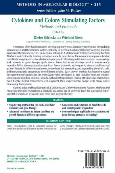 Primary Immunodeficiencies Caused by Defects of Cytokines and Cytokine Receptors.- Detection Assays for Cytokines and Growth Factors.- Intracellular Detection of T-Cell Cytokines.- Analysis of Cytokine Profiles in Human Skin.- Intracytoplasmic Detection of Proinflammatory Cytokines and Chemokines in Monocytes by Flow Cytometry.- Flow-Cytometric Immune Function Methodology for Human Peripheral Blood Dendritic Cells.- Evaluation of the Frequency of Virus-Specific CD8+T Cells by Cytokine Flow Cytometry.- Detection of Common Cytokine and Colony Stimulating Factor Gene Polymorphisms.- Apoptosis Induction by TRAIL.- Angiogenic Cytokines.- Detection Assays for Cytokines and Growth Factors.- Experimental Strategies for Combined Suicide and Immune Cancer Gene Therapy.- Gene Therapy with Plasmids Encoding Cytokine- or Cytokine Receptor-IgG Chimeric Proteins.- Interferon-? Gene Therapy for the Treatment of Arthritis.- Gene Gun-Based In Vivo Gene Transfer.- Purification of the Eucaryotic Heat-Shock Proteins Hsp70 and gp96.- Genetic Engineering of a Recombinant Fusion Protein Possessing an Antitumor Antibody Fragment and a TNF-? Moiety.- Genetic Engineering of Dendritic Cells by Adenovirus-Mediated TNF-? Gene Transfer.- Retroviral Transfer of T-Cell Receptor Genes into Human Peripheral Blood Lymphocytes.- Gene Transfer to Articular Chondrocytes with Recombinant Adenovirus.- Gene Therapy of X-Linked Severe Combined Immunodeficiency.- Gene Transfer for Generation of Tumor and Leukemia Vaccines.- Cytokine Gene Delivery into the Central Nervous System Using Intrathecally Injected Nonreplicative Viral Vectors.- Ex Vivo Cell Expansion.- In Vitro Regulation of Colony Stimulating Factor-Mediated Hematopoiesis in Healthy Individuals and Patients with Different Types of MyeloproliferativeDisease.- In Vitro Generation of Dendritic Cells from Cord Blood CD34+Hematopoietic Progenitors Cells.- Generation of TransgenicT Cells from Human CD34+Cord Blood Cells.- Ex Vivo Expansion of Umbilical Cord Blood Cells on Feeder Layers.- Ex Vivo Production of Cord Blood CD34+Derived Myeloid Precursors After Serum-Free Static Culture.- 27 Ex Vivo Expansion of Hematopoietic Stem Cells.- 28 Large-Scale Ex Vivo Expansion of Human Megakaryocytes for Clinical Use.- Cytokine-Mediated Expansion of Human NOD-SCID-Repopulating Cells.- Maturation and Differentiation of Dendritic Cells.- Differentiation of Human Antigen-Presenting Dendritic Cells from CD34+Hematopoietic Stem Cells In Vitro.- Dendritic Cell Development from Mobilized Peripheral Blood CD34+Cells.- In Vitro Maturation of Dendritic Cells from Blood Progenitors.- Generation of Human Type 1- and Type 2-Polarized Dendritic Cells from Peripheral Blood.- Preparation of Human Dendritic Cells for Tumor Vaccination.- Generation of Leukemic Dendritic Cells from Patients with Acute Myeloid Leukemia.