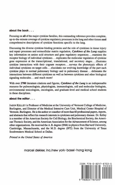 Focusing on all the major cytokine families, this reference book provides coverage of cytokine regulatory processes in the lung and other tissues and comprehensive descriptions of cytokine functions specific to the lung.;Discussing the diverse cytokine-binding proteins and the role of cytokines in tissue injury and repair processes and extracellular matrix regulations, the book supplies information on amino acid structure and gene regulatory sequences, examines the receptor biology of individual cytokines, illustrates cytokine interactions with their cognate receptors and surveys the phenotypic effects of individual cytokines on target cells. With over 2700 literature citations and figures, this book is a resource for pulmonologists, physiologists, immunologists, cell and molecular biologists, environmental toxicologists, oncologists, and graduate-level and medical school students in these disciplines.