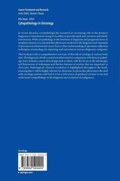In recent decades, cytopathology has assumed an increasing role in the primary diagnosis of mass lesions owing to its ability to deliver rapid, non-invasive, and timely information. This book provides a comprehensive overview of the role of cytology at various body sites. The diagnostic details covered are abbreviated in comparison with those in pathology texts. Instead, a more clinical approach is taken, with the focus on the advantages and limitations of techniques and the key features of entities that are important to clinicians. Pathological-clinical correlation is highlighted throughout the book, ensuring that it will be highly relevant for clinicians. In particular, physicians who deal with oncology patients will find it to be a rich source of guidance on how to use and understand cytopathology in the diagnosis and exclusion of malignancy.
