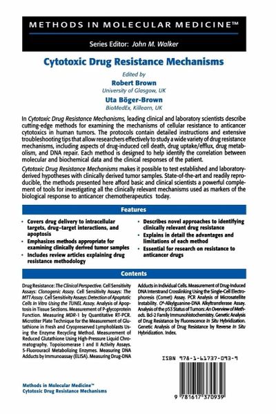 "This book provides a comprehensive guide to a range of methods to a diverse range of drug resistance mechanisms including: Multidrug resistance (P-glycoprotein and MDR-1 gene analysis); cell sensitivity (clonogenic and MTT assays); Apoptosis (TUNEL, p 53 and Bcl-2); Glutathione-associated resistance (enzyme based glutathione assay and a HPLC method for reduced glutathione); DNA repair defects and damage (topoisomerase activity assays and DNA adduct measurements); 5-Fluorouracil metabolizing enzymes; Genetic analysis including microsatellite instability and fluorescence in situ hybridization....The methods are clearly described with each chapter consisting of an introduction and well described materials and methods sections. An extremely useful addition to most chapters was the "Notes" section where the respective authors suggest very useful hints, problem solving approaches and advice on the interpretation of results....the book is well written and useful addition to any laboratory investigating drug resistance in either clinical samples or tumor cell lines."-Cancer Forum