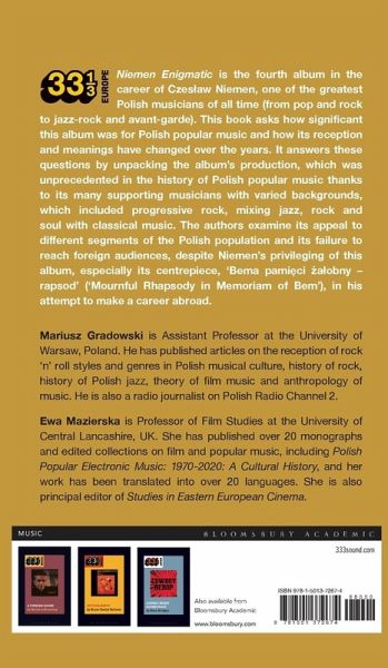 Niemen Enigmatic is the fourth album in the career of Czeslaw Niemen, arguably one of the greatest Polish musicians of all time (from pop and rock to jazz-rock and avant-garde). The book asks how significant was this album? How enduring is its popularity? Has the popularity and meanings changed over time? It does this by unpacking its production, which was unprecedented in the history of the Polish popular music due to its large number of musicians with varied backgrounds, including progressive rock, mixing jazz, rock and soul with classical music. It also examines its appeal to different segments of Polish population, and failure to reach foreign audiences, despite Niemen himself privileging this album, especially its centrepiece, Bema pamieci zalobny rapsod (Mournful Rhapsody in Memoriam of Bem aka A Funeral Rhapsody in Memory of General Bem aka Mourner's Rhapsody), in his attempt to make a career abroad.