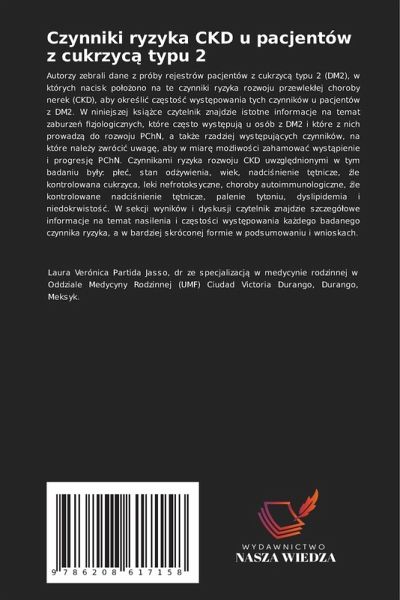 Autorzy zebrali dane z próby rejestrów pacjentów z cukrzyc¿ typu 2 (DM2), w których nacisk po¿o¿ono na te czynniki ryzyka rozwoju przewlek¿ej choroby nerek (CKD), aby okre¿li¿ cz¿sto¿¿ wyst¿powania tych czynników u pacjentów z DM2. W niniejszej ksi¿¿ce czytelnik znajdzie istotne informacje na temat zaburze¿ fizjologicznych, które cz¿sto wyst¿puj¿ u osób z DM2 i które z nich prowadz¿ do rozwoju PChN, a tak¿e rzadziej wyst¿puj¿cych czynników, na które nale¿y zwróci¿ uwag¿, aby w miar¿ mo¿liwo¿ci zahamowä wyst¿pienie i progresj¿ PChN. Czynnikami ryzyka rozwoju CKD uwzgl¿dnionymi w tym badaniu by¿y: p¿e¿, stan od¿ywienia, wiek, nadci¿nienie t¿tnicze, ¿le kontrolowana cukrzyca, leki nefrotoksyczne, choroby autoimmunologiczne, ¿le kontrolowane nadci¿nienie t¿tnicze, palenie tytoniu, dyslipidemia i niedokrwisto¿¿. W sekcji wyników i dyskusji czytelnik znajdzie szczegó¿owe informacje na temat nasilenia i cz¿sto¿ci wyst¿powania kädego badanego czynnika ryzyka, a w bardziej skróconej formie w podsumowaniu i wnioskach.