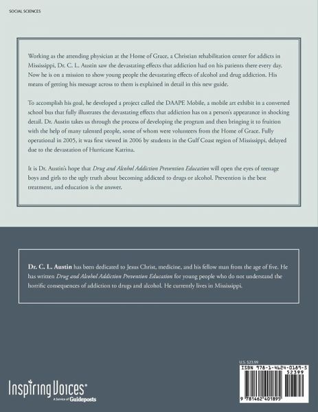 Working as the attending physician at the Home of Grace, a Christian rehabilitation center for addicts in Mississippi, Dr. C. L. Austin saw the devastating effects that addiction had on his patients there every day. Now he is on a mission to show young people the devastating effects of alcohol and drug addiction. His means of getting his message across to them is explained in detail in this new guide. To accomplish his goal, he developed a project called the DAAPE Mobile, a mobile art exhibit in a converted school bus that fully illustrates the devastating effects that addiction has on a person's appearance in shocking detail. Dr. Austin takes us through the process of developing the program and then bringing it to fruition with the help of many talented people, some of whom were volunteers from the Home of Grace. Fully operational in 2005, it was first viewed in 2006 by students in the Gulf Coast region of Mississippi, delayed due to the devastation of Hurricane Katrina. It is Dr. Austin's hope that Drug and Alcohol Addiction Prevention Education will open the eyes of teenage boys and girls to the ugly truth about becoming addicted to drugs or alcohol. Prevention is the best treatment, and education is the answer.