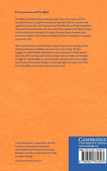 The Bible, as this book demonstrates, plays a key role in nearly all D. H. Lawrence's work. It supplies not only the inspiration but on occasion the target for his parody. In D. H. Lawrence and The Bible, Terry Wright establishes that Lawrence was familiar with the modernist critique of the Bible by higher critics and by anthropologists of religion. He also argues, however, that Lawrence's playful reworking of the Bible, like that of Nietzsche, anticipates postmodernism. After considering the extraordinary range of Lawrence's reading and the inter texts between the Bible and Lawrence's own writing, Wright engages in a theoretically informed but clear exploration of the textual dynamics of his writing. Lawrence's writing is seen to reveal a prolonged struggle to read the Bible in a much broader spirit than that encouraged by orthodox Christianity. Wright's study sheds light not only on his work but on the Bible on the creative process itself.