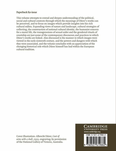 List of illustrations; List of contributors; Acknowledgements; Dürer and his culture: an introduction Dagmar Eichberger, and Charles Zika; Part I. Artist and Environment: 1. Naturalia and artefacta: Dürer's nature drawings and early collecting Dagmar Eichberger; 2. Germanic patriotism in the age of Dürer Larry Silver; 3. The Michelfeldt Tapestry and contemporary European literature Wim Hüsken; Part II. Image and Audience: 4. Ways of seeing in the age of Dürer Bob Scribner; 5. Dürer's witch and riding women: shaping moral order in sixteenth-century Germany Charles Zika; Part III. Communal Culture and Representation: 6. Tokens of affection: the meanings of love in sixteenth-century Germany Lyndal Roper; 7. The censorship of images in Reformation Germany 1520-1560 Christiane Andersson; Part IV. Dürer and the Canon: 8. Changing German perceptions of the historical role of Albrecht Dürer Paul Münch; 9. The making of Dürer in the collection of the National Gallery of Victoria Irena Zdanowicz; Select bibliography: Albrecht Dürer (1971-1997); Dagmar Eichberger and Charles Zika; Index.