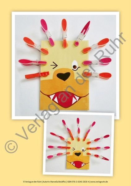 Karteikarten für die Arbeit mit Kita-Kindern sowie für den Anfangsunterricht in der Grundschule und für Eltern +++ Mit diesen kreativen Feinmotorik-Förderkarten geben Sie Kindern von drei bis acht Jahren Spiel, Spaß und Frühförderung buchstäblich selbst in die Hand. Auf jeder Bildkarte ist eine schöne Illustration in fröhlich-bunten Farben zu sehen - doch erst durch das Anbringen von Wäscheklammern an den richtigen Stellen entsteht ein fertiges Bild. Die Kinder knobeln und klemmen, haben jede Menge Spaß und trainieren spielerisch Feinmotorik, Druckdosierung und Auge-Hand-Koordination. Auch Konzentration und Fantasie werden altersgerecht angeregt. Beispielsweise zaubern die Kinder dem Löwen mit Wäscheklammern seine Löwenmähne, dem Kaktus seine Stacheln und dem Eis einen Stiel. Sie selbst müssen sich gar nicht groß dahinterklemmen: Auf der Rückseite jeder Karteikarte ist das jeweilige Motiv zur Selbstkontrolle noch einmal mit fertig angebrachten Wäscheklammern abgebildet. So könnensich die Kinder komplett selbstständig mit den Knobelkarten beschäftigen und ihr Ergebnis direkt selbst überprüfen. Die Wäscheklammern zum Vervollständigen besorgen Sie wahlweise in den passenden Farben oder Sie malen gemeinsam mit den Kindern Holzwäscheklammern farbig an. Ob im Kindergarten, im Anfangsunterricht oder auch zu Hause: Die 20 lustigen Wäscheklammer-Bilder garantieren spielerisches Feinmotorik-Training und spannenden Knobelspaß. Ein echter Glücksgriff also, den die Kinder gar nicht mehr aus der Hand geben wollen.