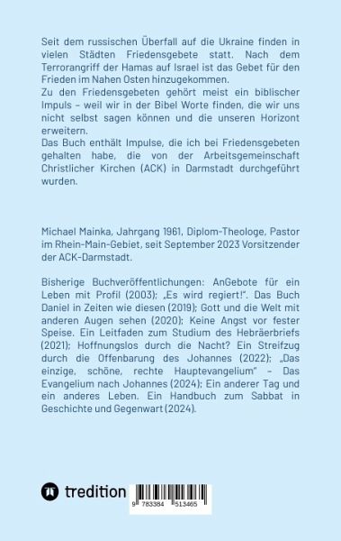 Das vorliegende enthält biblische Impulse, die der Verfasser bei Friedensgebeten gehalten hat, die von der Arbeitsgemeinschaft Christlicher Kirchen (ACK) in Darmstadt durchgeführt wurden. In ihnen geht es um die Seligpreisungen, die (ganz andere) "Waffenrüstung Gottes" und um die Bitten des Vaterunsers.