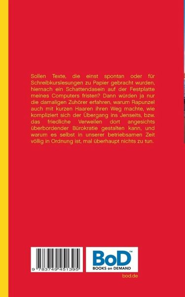 Sollen Texte, die einst spontan oder für Schreibkurslesungen zu Papier gebracht wurden, hiernach ein Schattendasein auf der Festplatte meines Computers fristen? Dann würden ja nur die damaligen Zuhörer erfahren, warum Rapunzel auch mit kurzen Haaren ihren Weg machte, wie kompliziert sich der Übergang ins Jenseits, bzw. das friedliche Verweilen dort angesichts überbordender Bürokratie gestalten kann, und warum es selbst in unserer betriebsamen Zeit völlig in Ordnung ist, mal überhaupt nichts zu tun.